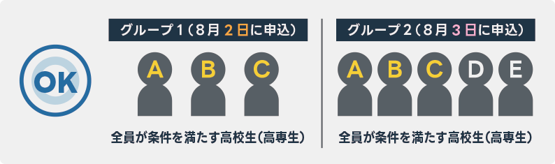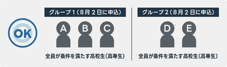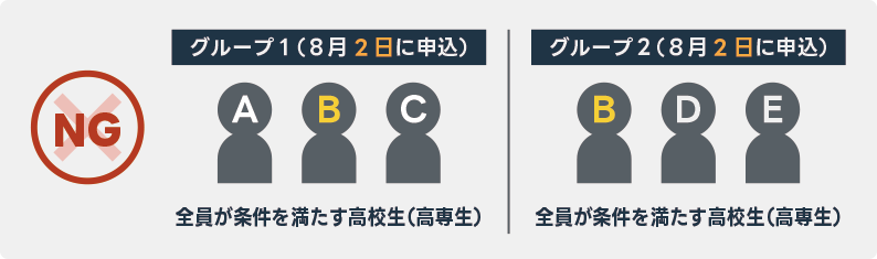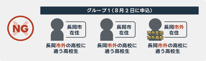 → 高校生(高専生)のみ対象のためグループ全員が落選対象です。長岡市外在住で長岡市外の高校に通う高校生を含むグループ