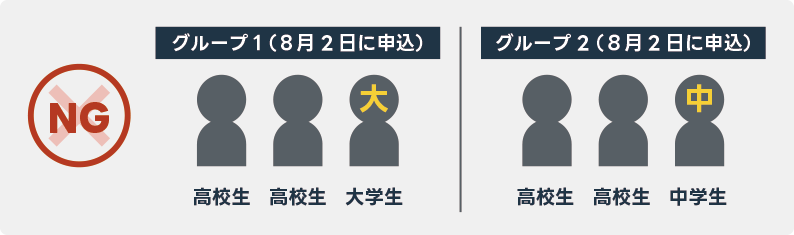 → グループ1・グループ2全員が落選対象です。グループ1には「大学生」、グループ2には「中学生」が含まれる